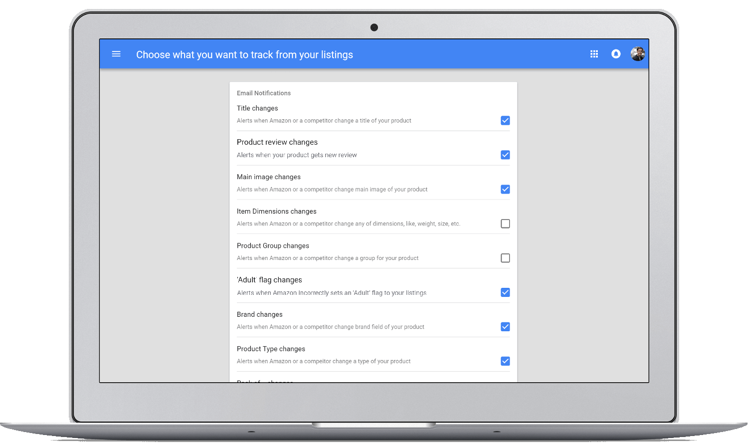 With our ASIN tracker you'll know about any changes to your Amazon listings.
